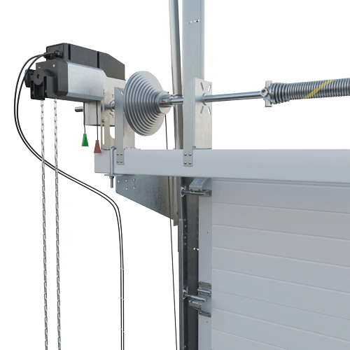 Assurez la sécurité de votre entrepôt avec notre porte de garage équipée de deux systèmes de pare-chutes en cas de rupture du système de ressort ou des câbles.